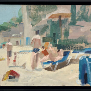 Cette oeuvre, peinte à l’huile sur toile, évoque une scène estivale détendue au bord d’une piscine, où vacanciers et transats se fondent dans une atmosphère tropicale. Caisse américaine en bois et noir.
