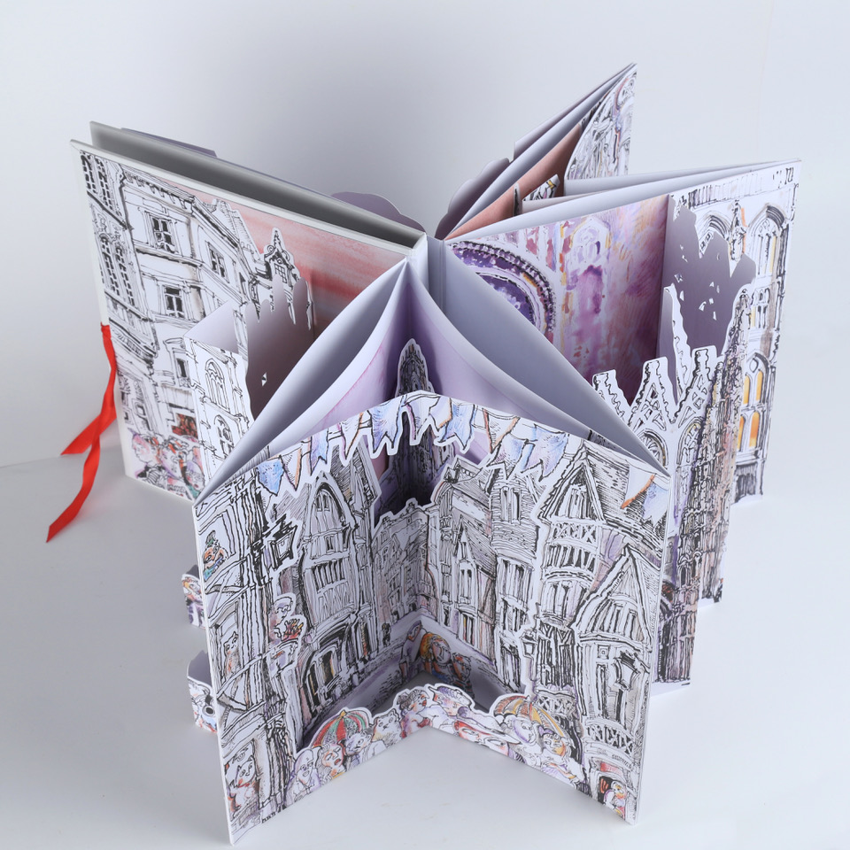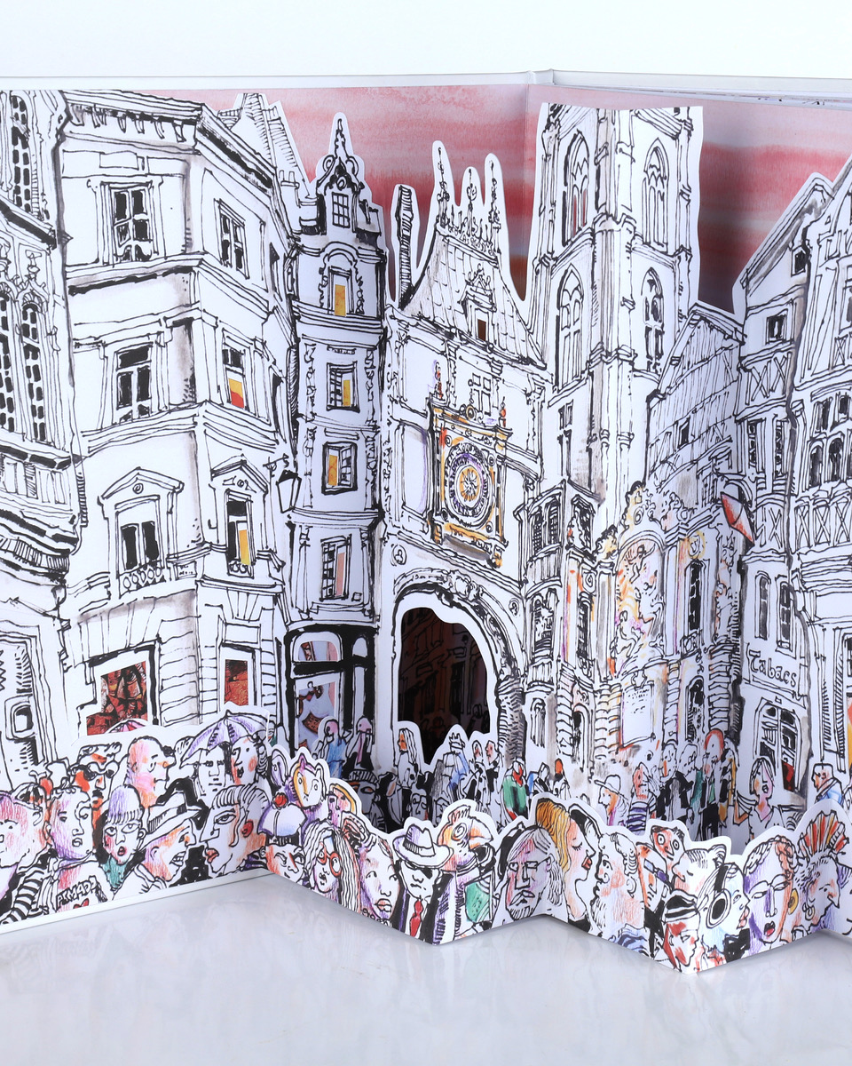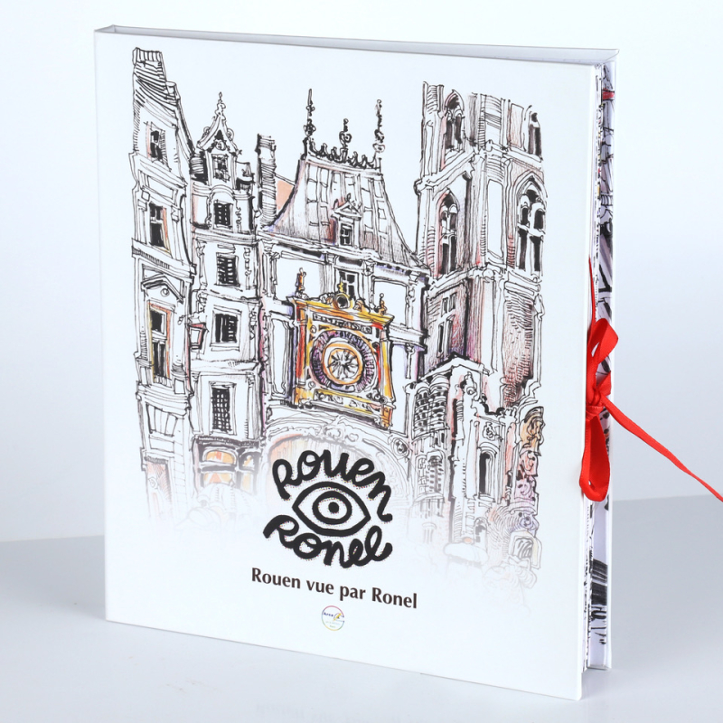 « Rouen vue par Ronel » est un livre en relief, un « pop up » dans lequel l’artiste nous fait découvrir, au fil des pages, les places et monuments emblématiques de sa ville de cœur.