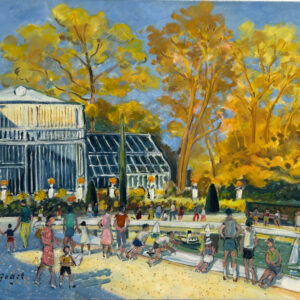 Cette oeuvre, peinte à l’huile sur toile, évoque une scène estivale détendue au bord d’une piscine, où vacanciers et transats se fondent dans une atmosphère tropicale. Caisse américaine en bois et noir.